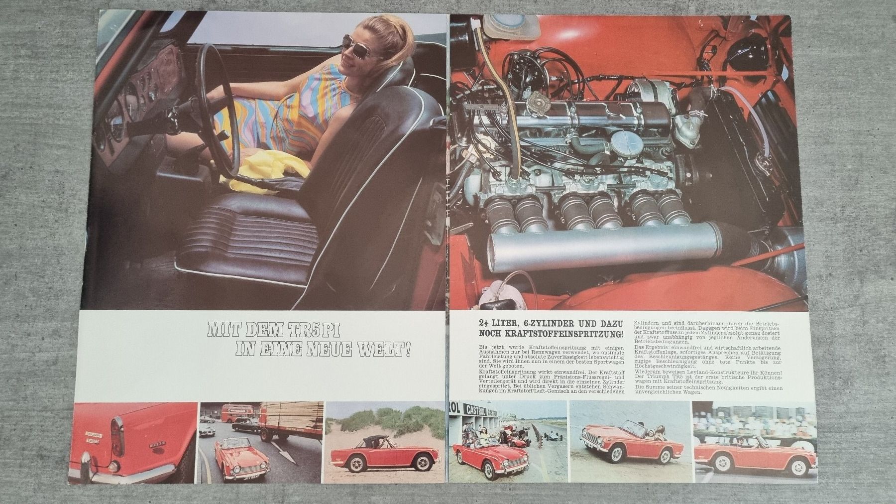 - Der rote 5er aus den Prospekten hat nochmal einen ganz anderen, einfacheren Luftsammler ohne das Triumph-Logo montiert. Ob das das ein Vorserien Pressefahrzeug war ??? Die allerersten Versuche sollen wohl in umgebauten TR4As gemacht worden sein.
